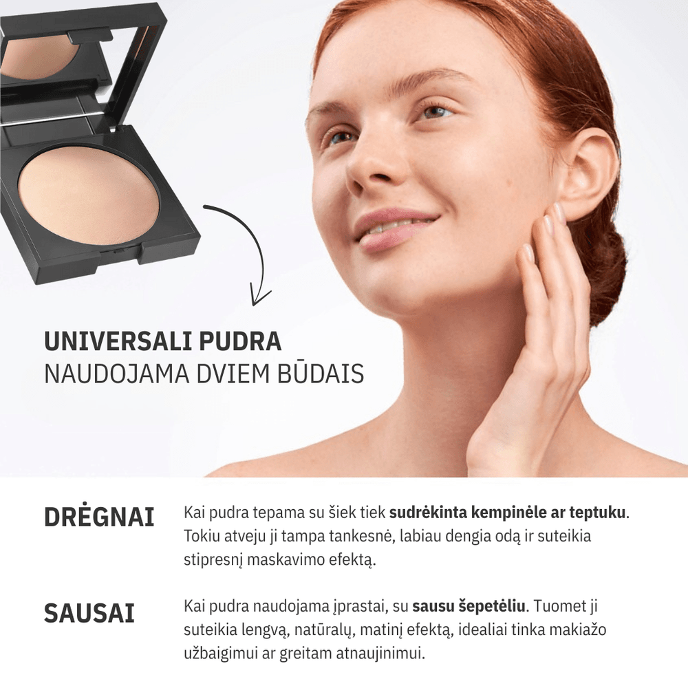 • Sausai – kai pudra naudojama įprastai, su sausu šepetėliu. Tuomet ji suteikia lengvą, natūralų, matinį efektą, idealiai tinka makiažo užbaigimui ar greitam atnaujinimui.