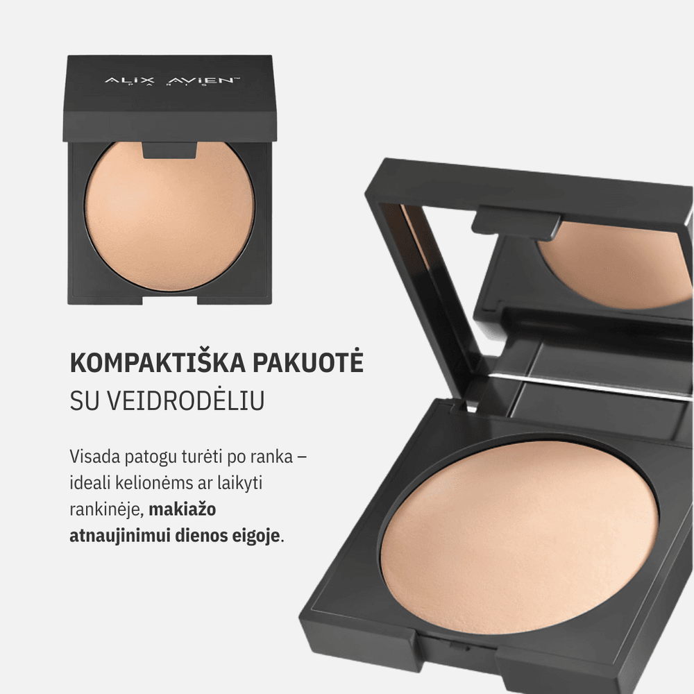 Tvirta, kokybiška pakuotė apsaugo produktą nuo trupėjimo, o veidrodėlis suteikia galimybę greitai atnaujinti makiažą, kad ir kur bebūtum.