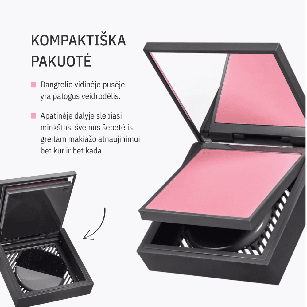 Skaistalai pateikiami elegantiškoje, kompaktiškoje pakuotėje – dangtelio vidinėje pusėje yra patogus veidrodėlis, o apatinėje dalyje slepiasi minkštas, švelnus šepetėlis greitam makiažo atnaujinimui bet kur ir bet kada.